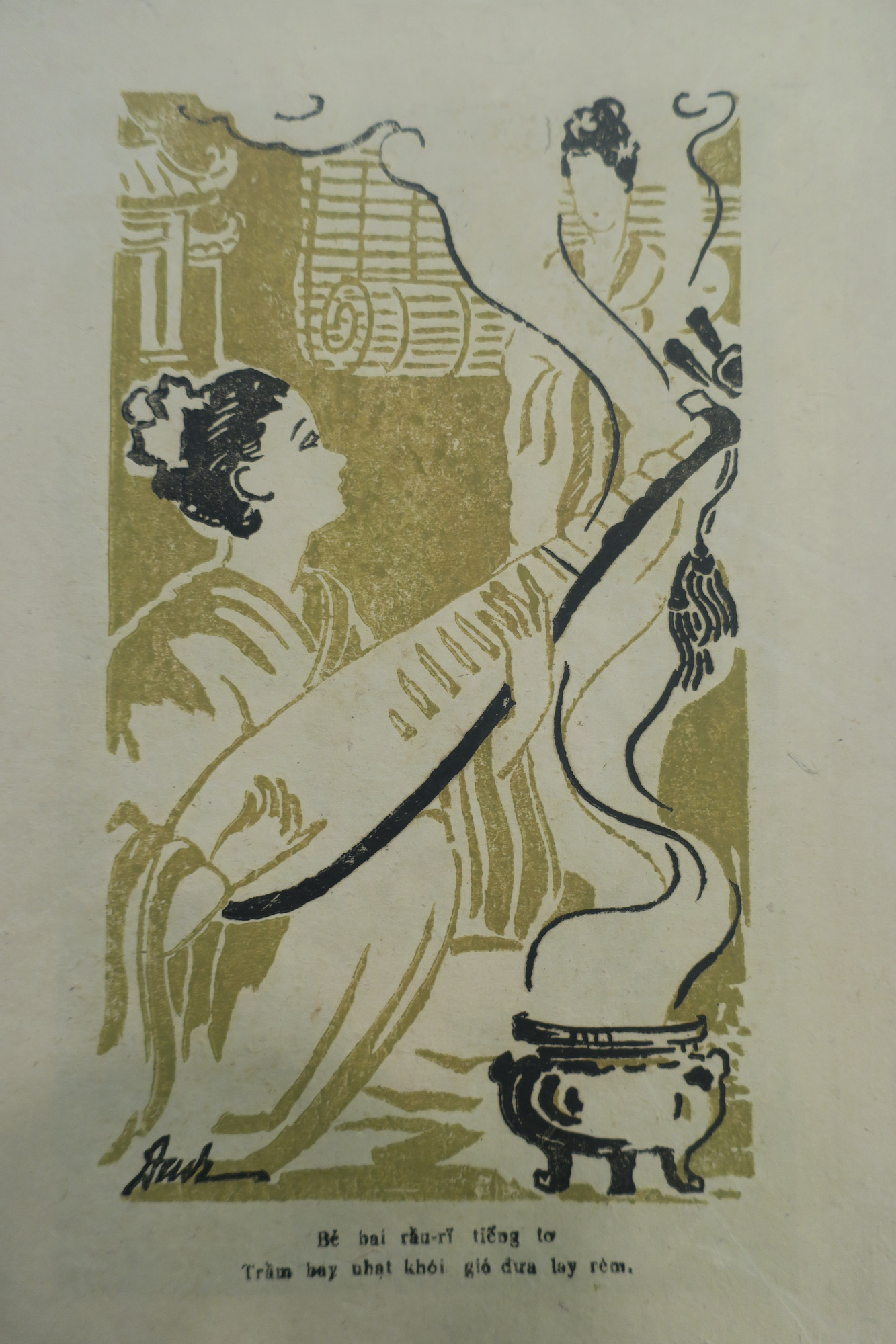 Tranh của họa sĩ Tôn Thất Đào minh họa cho câu Kiều: "Bẻ bai rủ rỉ tiếng tơ/ Trầm bay nhạt khói gió đưa lay rèm"