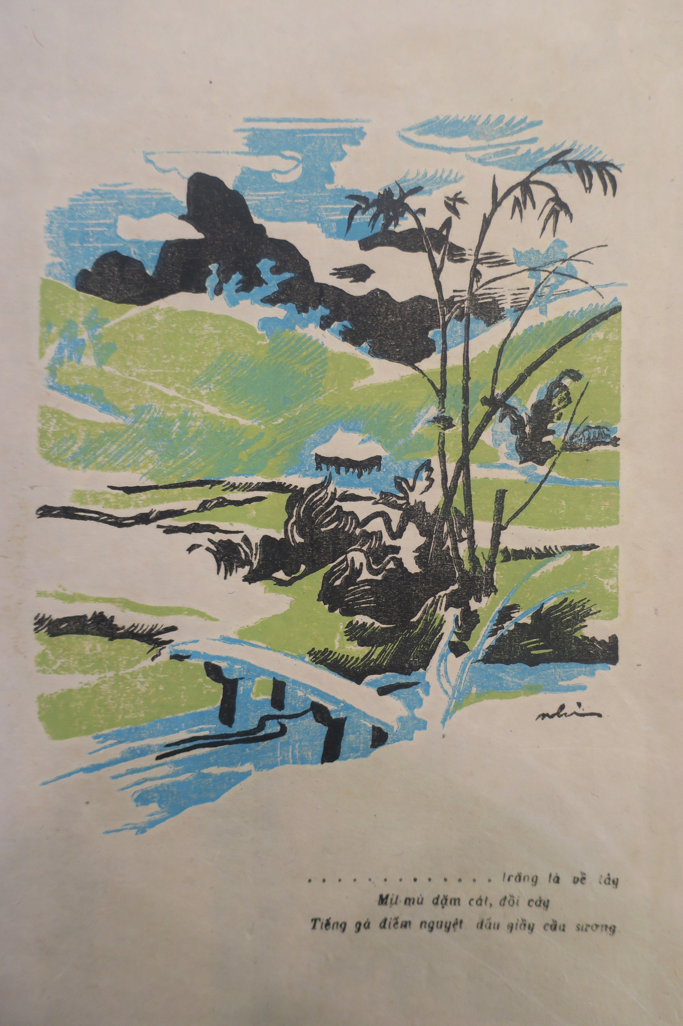 Tranh của họa sĩ Lương Xuân Nhị minh họa cho câu Kiều: "Mịt mù dặm cát đồi cây/ Tiếng gà điểm nguyệt dấu giầy cầu sương"