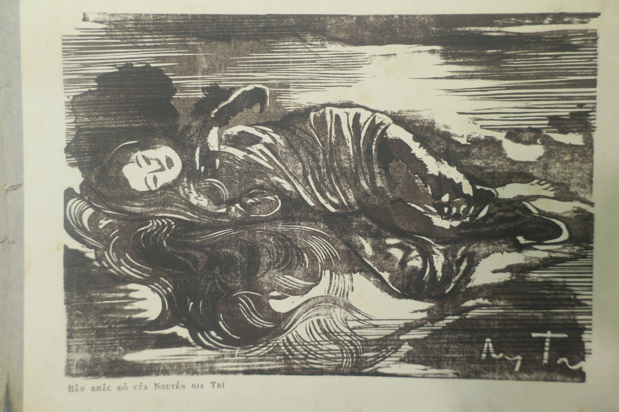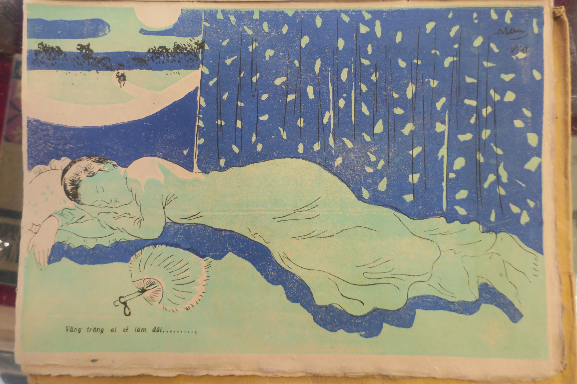 Bức tranh khắc gỗ của họa sĩ Nguyễn Tường Lân in trên giấy dó minh họa cho câu "Vầng trăng ai xẻ làm đôi/ Nửa in gối chiếc nửa soi dặm trường" là phụ bản của Tập Kiều văn họa - Ảnh: QSMT