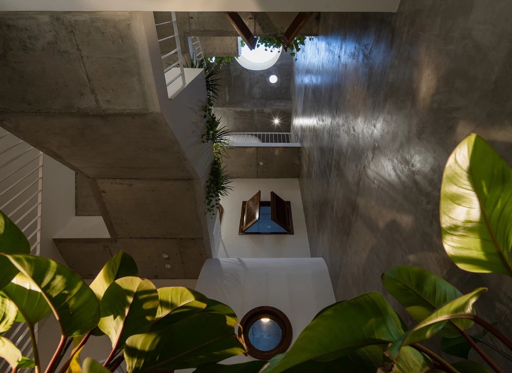 Vì ba mặt đều tiếp giáp các căn hộ lân cận và chỉ duy nhất mặt tiền hướng ra phía không gian mở nên một giếng trời hình chữ D được thiết kế để đem lại nguồn ánh sáng tự nhiên và thông gió nhiều nhất có thể cho 4 tầng lầu.