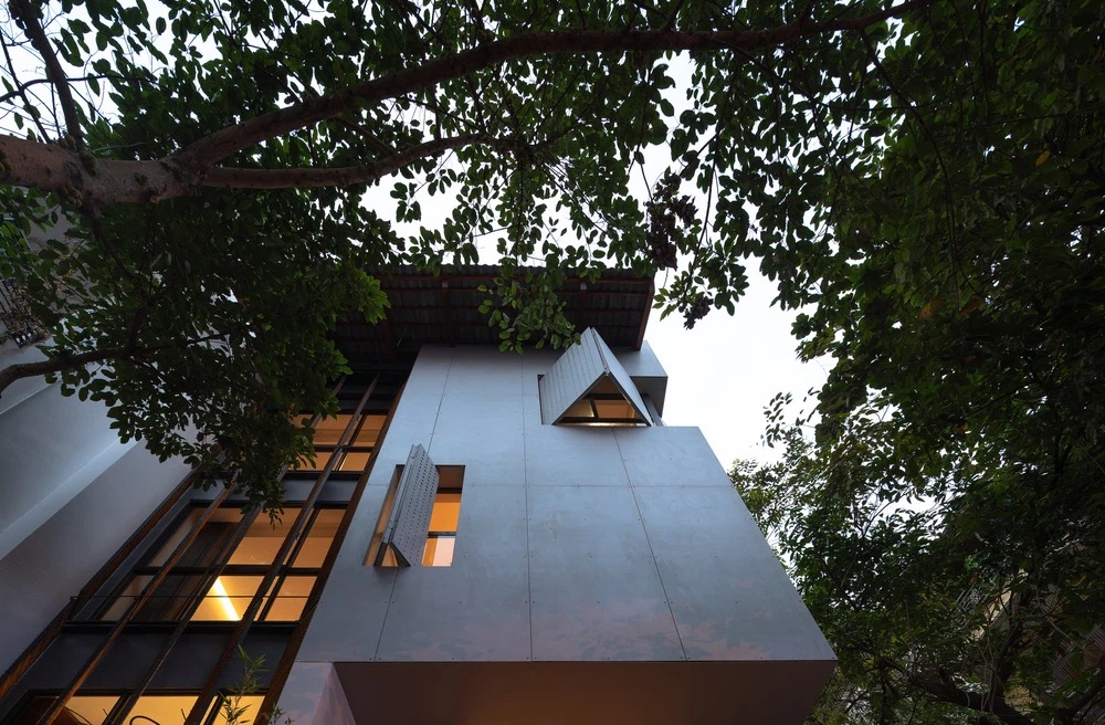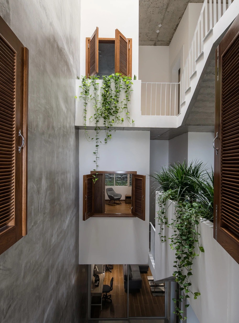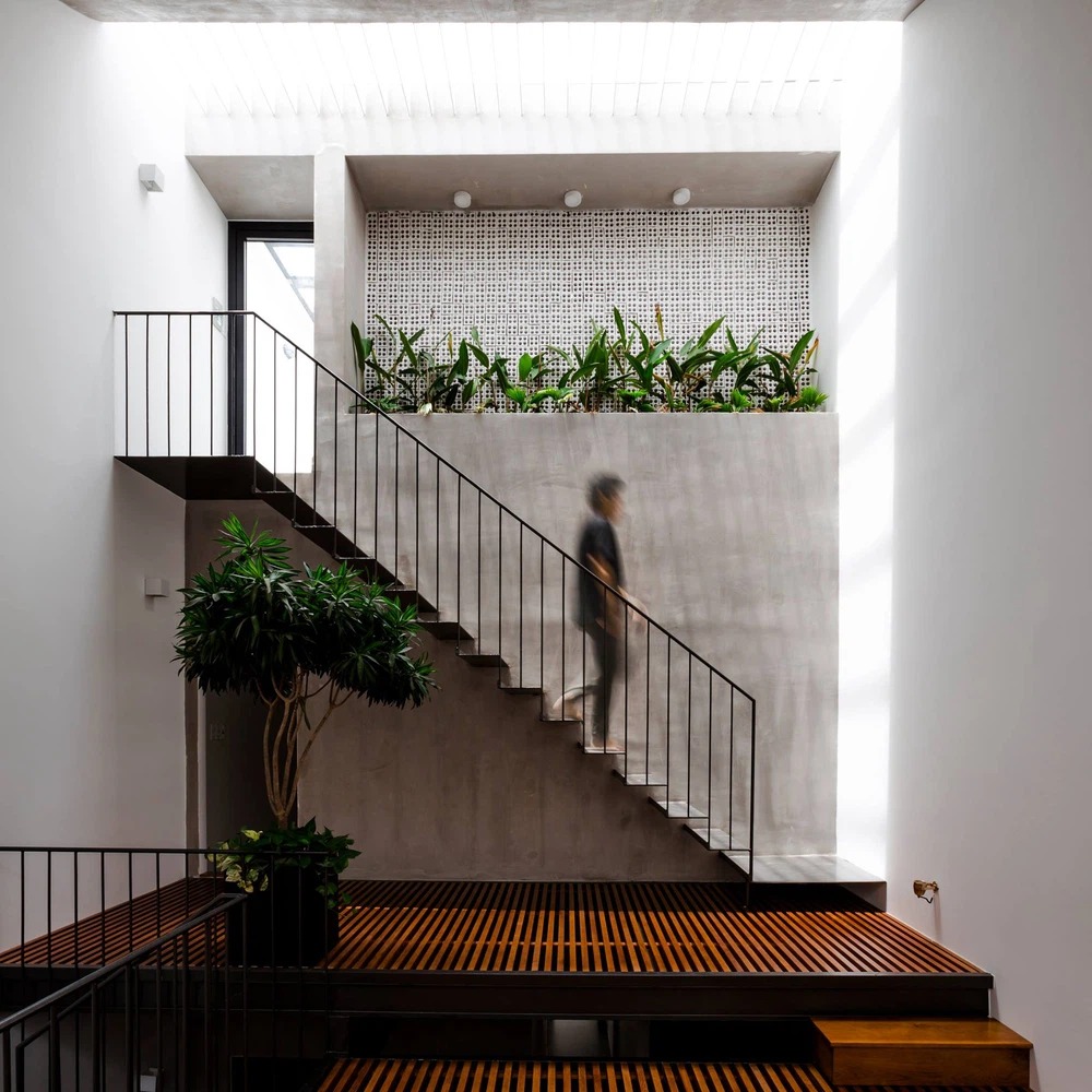 Ngôi nhà có diện tích 42m2, bởi chiều rộng chỉ 3,5m và chiều dài 12m. Nhìn từ bên ngoài, mỗi tầng lầu đều được xây lùi lại một chút, để dành không gian cho ban công trồng cây xanh dọc theo mặt tiền của căn nhà. Tuy là nhà phố nhưng độ thông thoáng bên trong được ưu tiên ở mức tối đa.