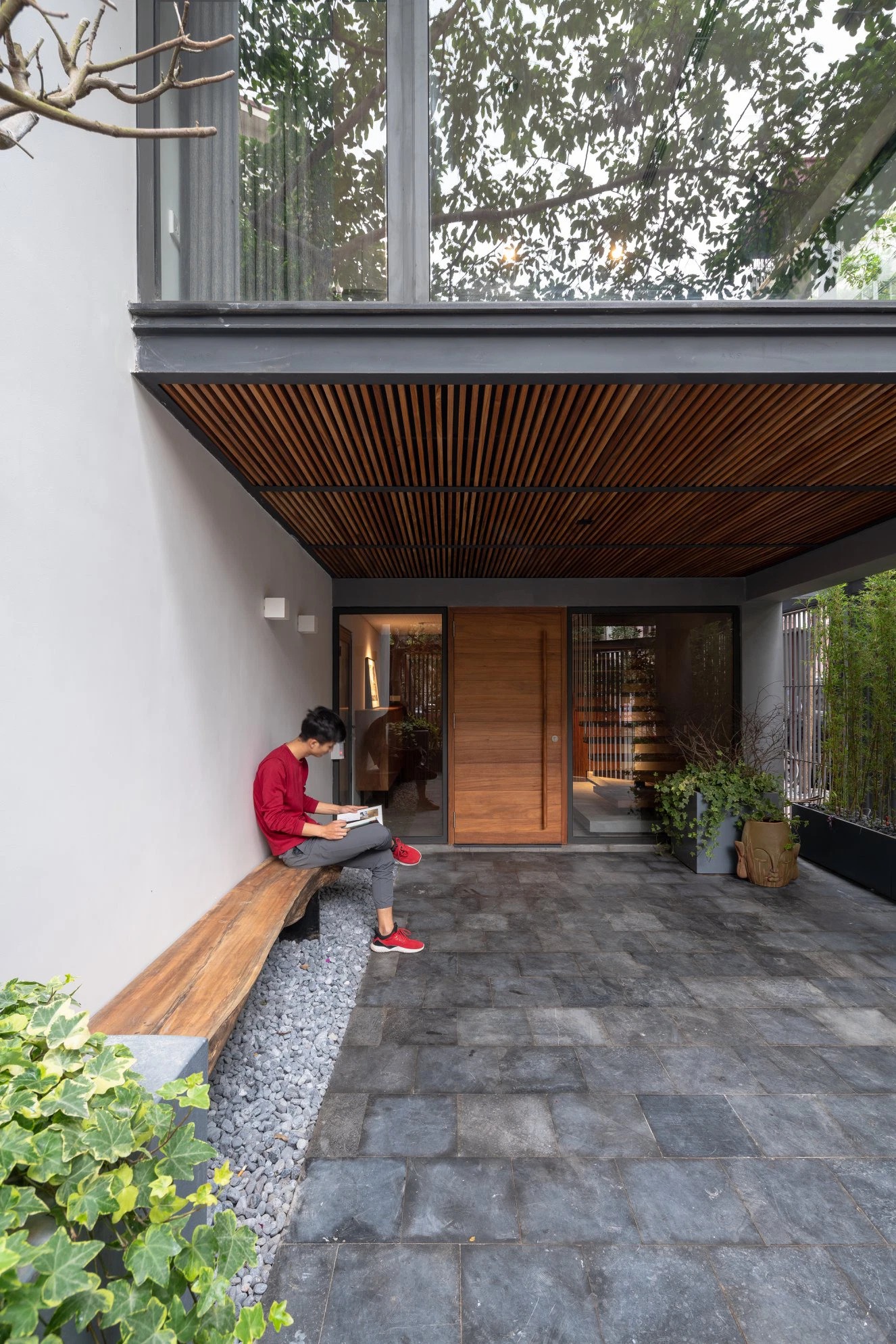 Maison T nhìn khá giản dị giữa phố phường đông đúc với phần cổng nhà được xây bằng những viên gạch nung xếp xen kẽ nhau. Khoảng sân phía trong cũng mang nhiều nét kiến trúc truyền thống và ngập tràn cây xanh.