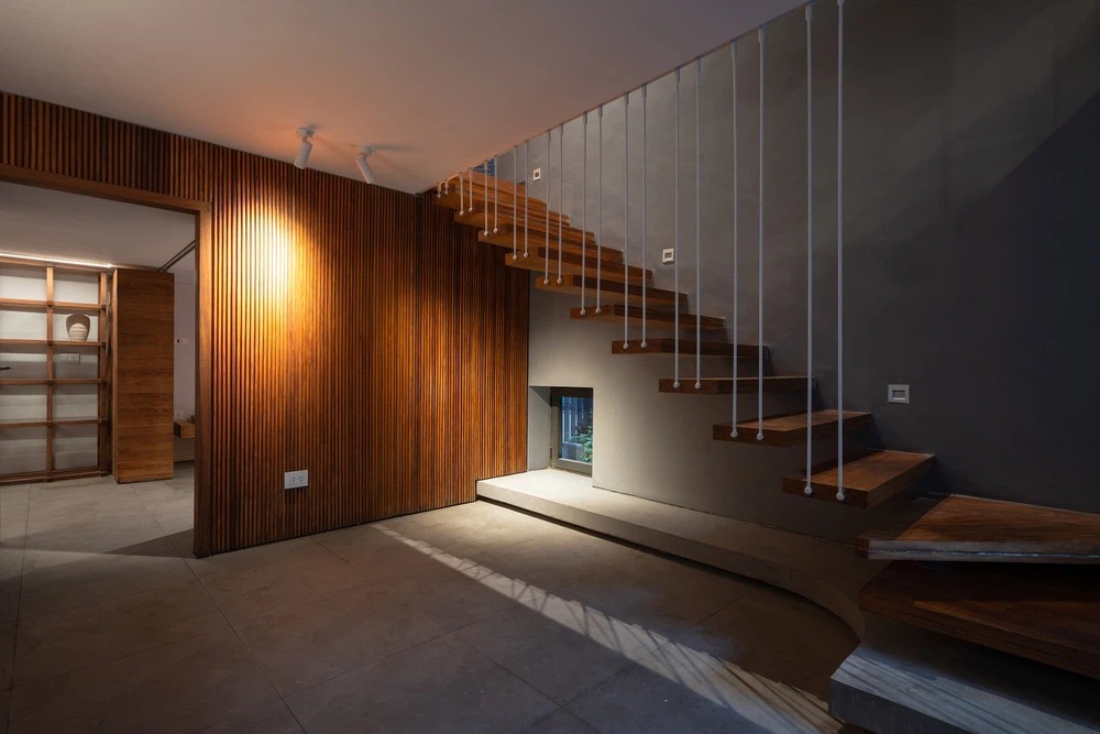 Thiết kế tường màu bê tông tạo cảm giác vừa thô sơ vừa mạnh mẽ. Đặc biệt, nhìn tổng quát, ngôi nhà giống như một mê cung với các hình khối cấu trúc độc đáo bao quanh hệ cầu thang lớn. Nội thất gỗ nâu đan xen các khoảng trắng xám giúp cân bằng lại độ ấm cho không gian.