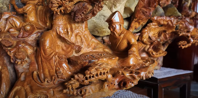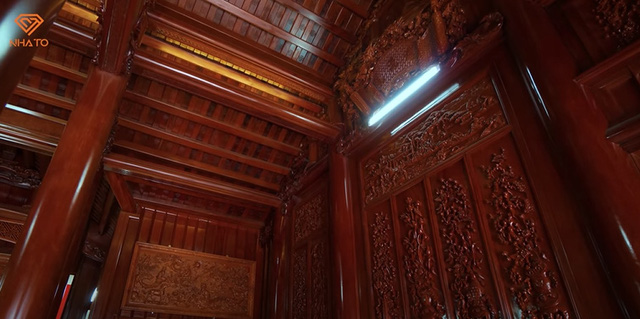 Góp phần vào không gian kiến trúc cổ quen thuộc chính là các bức tranh gỗ chạm xuyên suốt các không gian trong nhà. Từ bức tứ bình được chạm khắc đầy tinh xảo lên vách gỗ ngăn giữa các gian nhà, bức bát tiên kết hợp giữa gỗ và đá đầy nghệ thuật, cho đến bức gỗ Hương chạm khắc các con giáp theo tuổi từng thành viên trong gia đình… Tất cả đều khiến bất cứ ai chiêm ngưỡng cũng phải thích thú và tấm tắc trước mức độ chịu đầu tư của gia chủ.