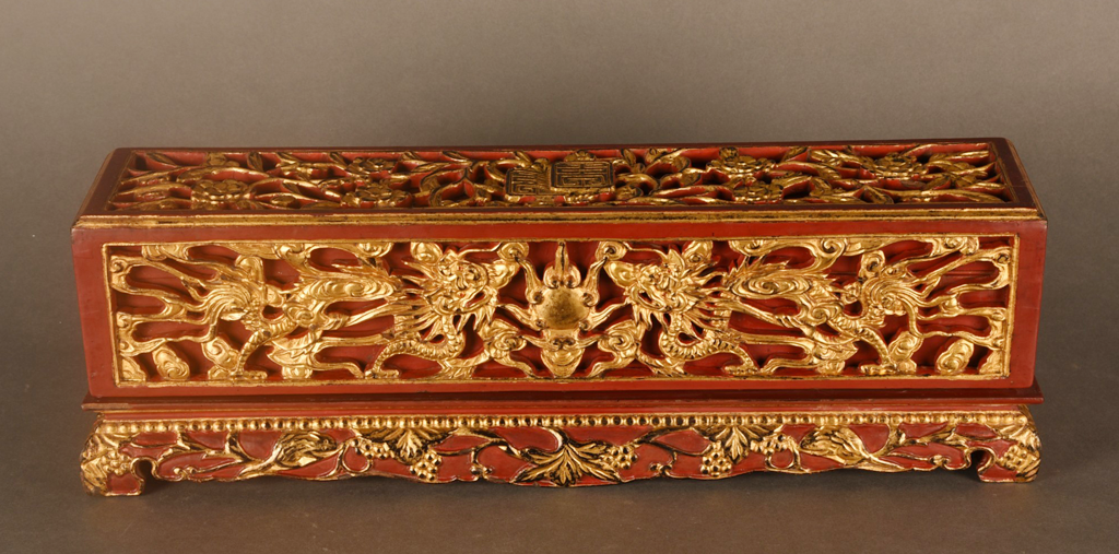 Hộp đựng sắc phong, gỗ chạm sơn thếp vàng“Lưỡng long chầu nhật”, thế kỷ 19